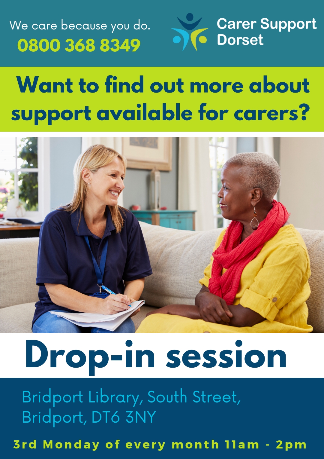 I will be at the Carer Support Dorset drop-in session at Bridport library on Monday from 11-2.