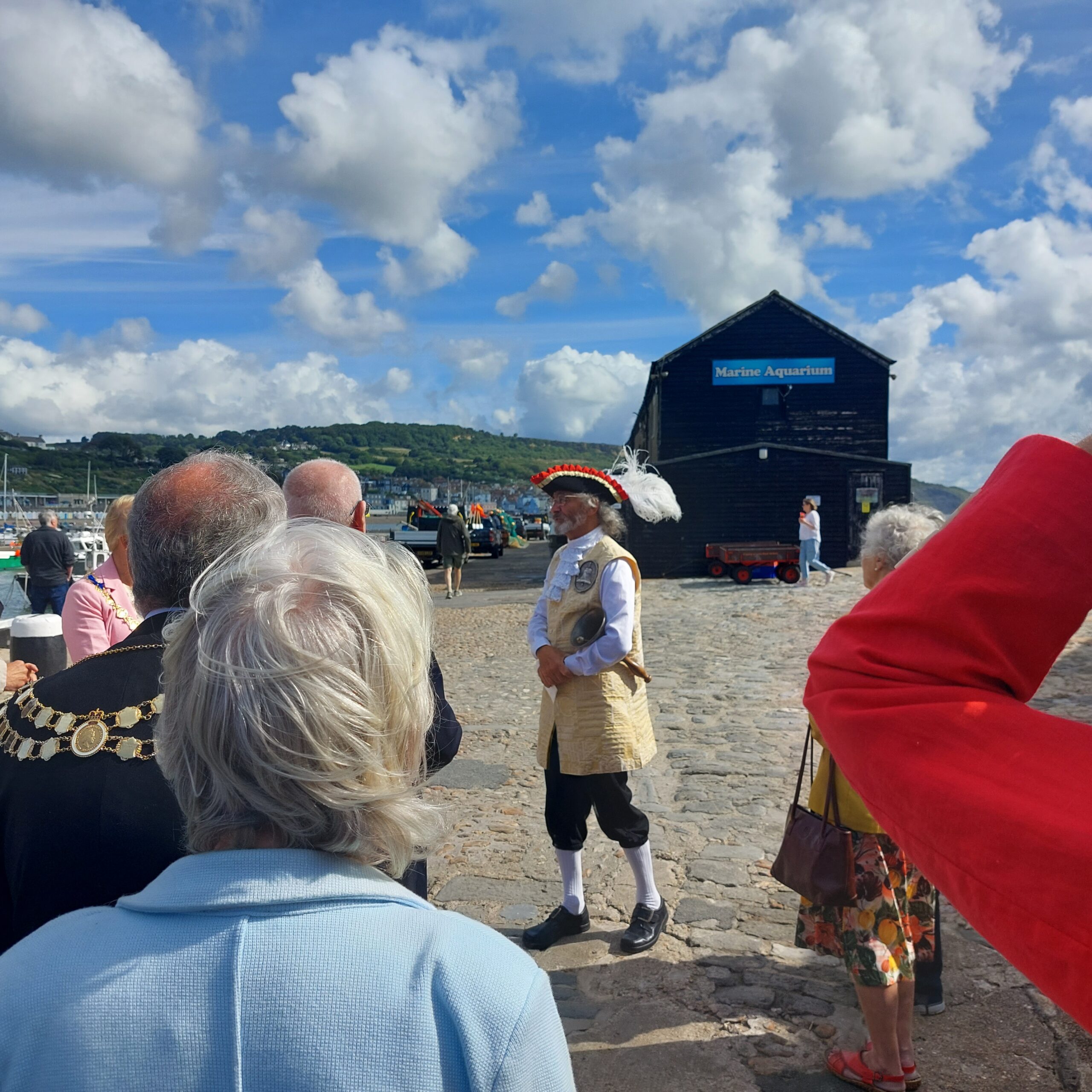On Monday, Bridget and I represented Bridport at the Lyme Regis Civic day hosted by Mayor and Mayoress David and Erica Sarson. Once again the sun shone, rather surprising for August! Their Town Crier ( Alan Vian) started the day with a fascinating history tour of the Cob and Lyme in general as we walked to the end of the Cob and back.