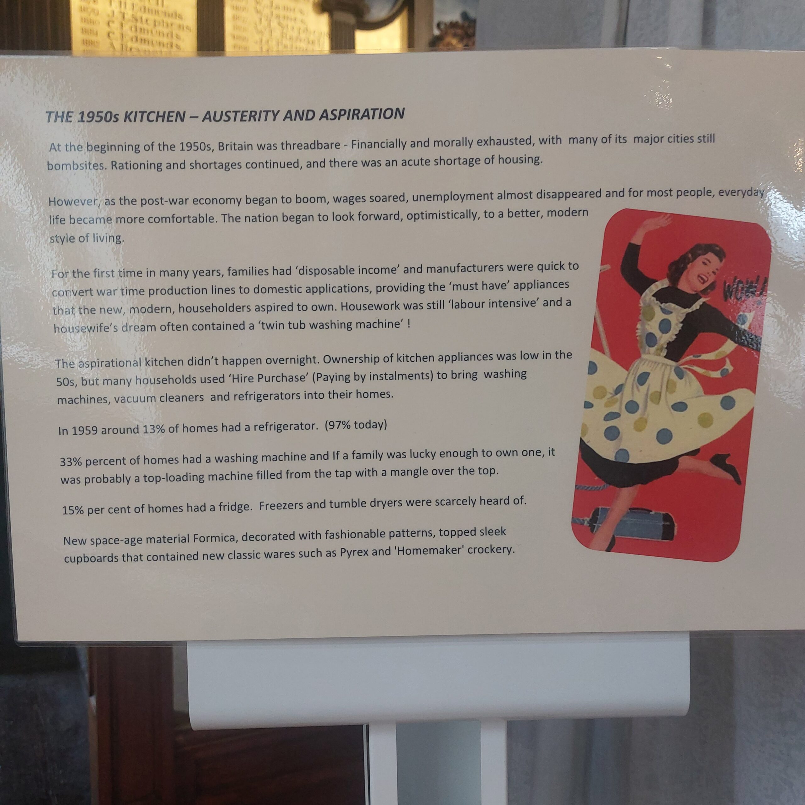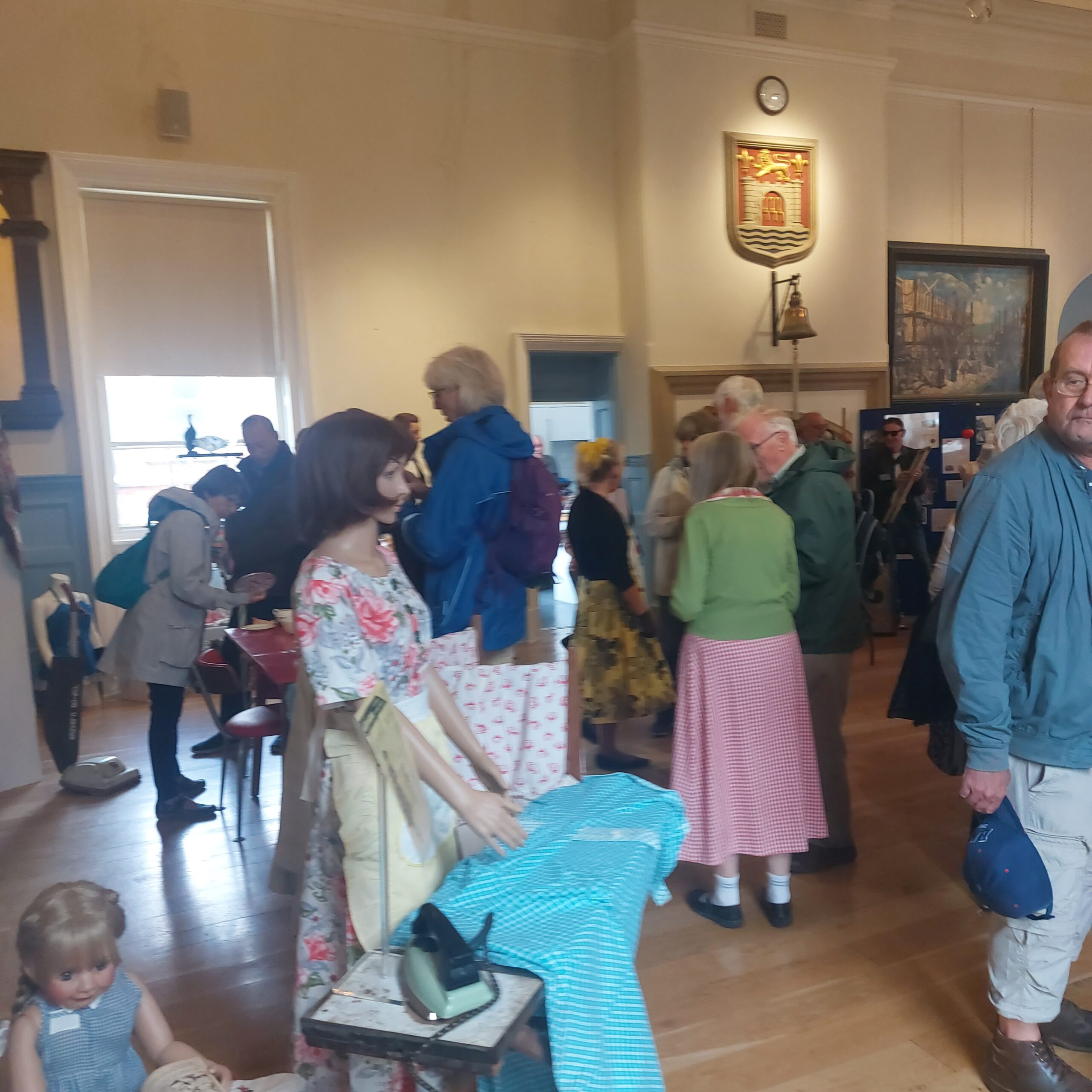 On Saturday morning the rain finally gave it a rest and so I had the opportunity to officially open the exhibition by joining our Town Crier outside in Bucky Doo square. As always John quickly drew a large crowd with a combination of his (very) bell ringing and loud voice and the humorous content of his proclamation soon had the crowd smiling. Then it was off to the Town Hall for the exhibition. What an overnight transformation! The volunteers had worked so hard in just a few hours to assemble all of the exhibits to truly bring back memories of the 50s for many of us and give a taste of what life was like then to those who were too young to remember. It truly was a decade for changes and new ideas in many spheres of life, all set against the backdrop of continued rationing. I had the pleasure of, once again, eating tapioca pudding (frog spawn) but drew the line at semolina and blancmange. There were many examples of day to day life, children’s toys, clothing and memorabilia that seemed to stimulate many conversations and reflections of living and growing up in the 50’s. Examples of an electric iron and vacuum cleaner reminded me that the society and expectations have certainly changed. Those changes are apparent today when we consider that we would not want to be without our refrigerators/freezers/cordless this and that, dishwashers, televisions, cars, computers, gaming stations, (Alexa?) and I almost forgot-mobile “phones”. I am sure there are many more things that could be added to this list?
